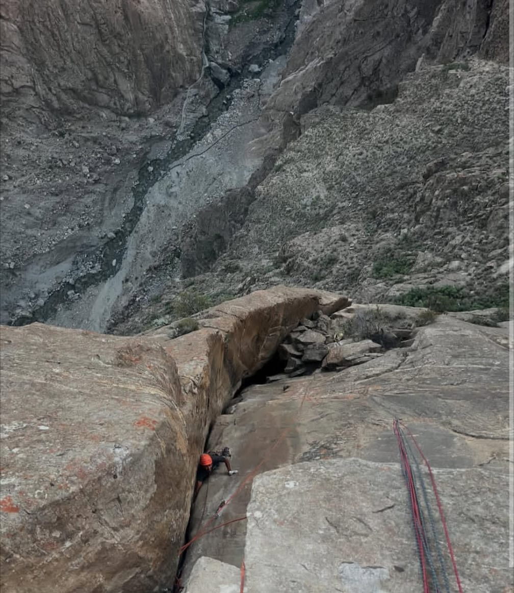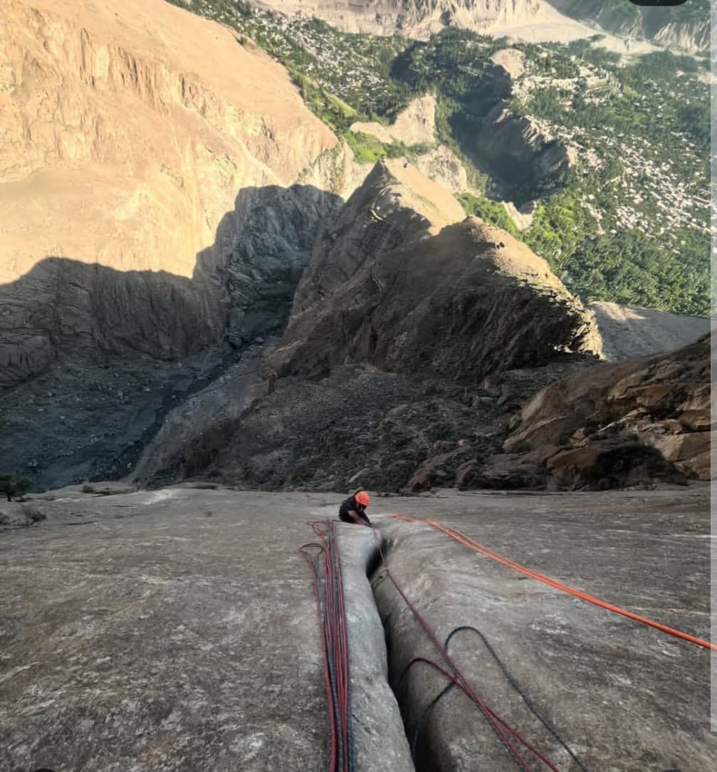 This 250m, 9-pitch mostly trad line offers solid rock, sustained cracks, and a few bolted sections. It is named the Bitan Fissure – The Shaman Crack, the first ever trad climbing route on such high elevation in Pakistan. The highlight of the climbing is the view of the Hunza valley and the 7000m peaks in the backdrop.